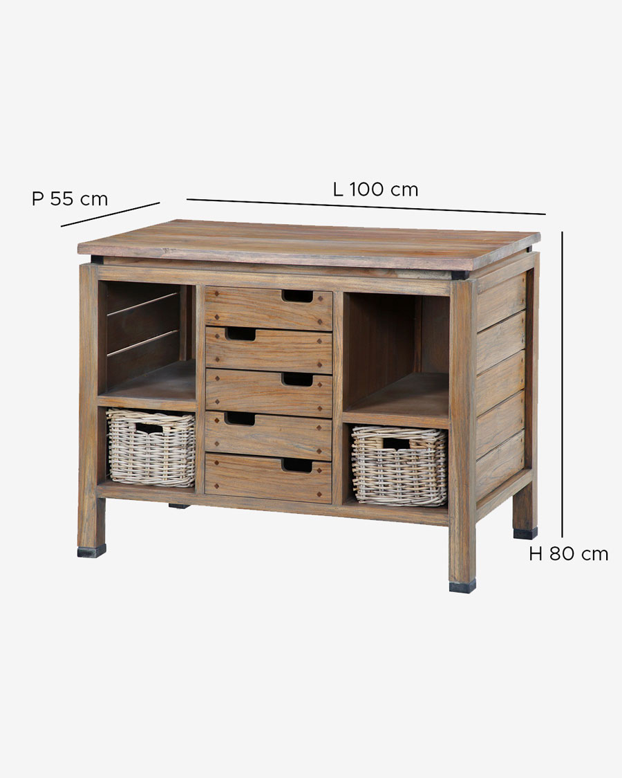 Ce superbe meuble sous vasque en teck massif Harmonie allie créativité et raffinement pour donner à votre salle de bains une style unique. Ses 5 tiroirs vous permettront de ranger vos produits de toilette. Dans les deux niches vous pourrez y stocker vos serviettes. Quant aux 2 paniers en rotin, ils donneront un peps supplémentaire et un air campagne à ce meuble. Qualité exceptionnelle, solidité et finitions font de ce meuble en teck naturel un élément important dans l'aménagement et la décoration de votre salle de bains. Il ne vous reste plus qu'à choisir une jolie vasque en marbre pour l'harmoniser avec ce meuble et votre pièce d'eau sera un réel espace détente. Longueur : 100 cm Profondeur : 55 cm Hauteur : 80 cm Matière structure : Teck massif Poids : 50 KG Tiroirs : 5 Niches : 4 Panier : 2 Vasque non fournie Paniers en rotin inclus